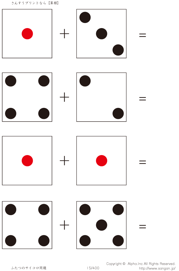 上記のボタンから「2つのサイコロの足し算」の算数数学ドリル・計算ドリル(PDFプリント)がダウンロードできます。個人利用は無料です(家庭以外での配布は有料です)。