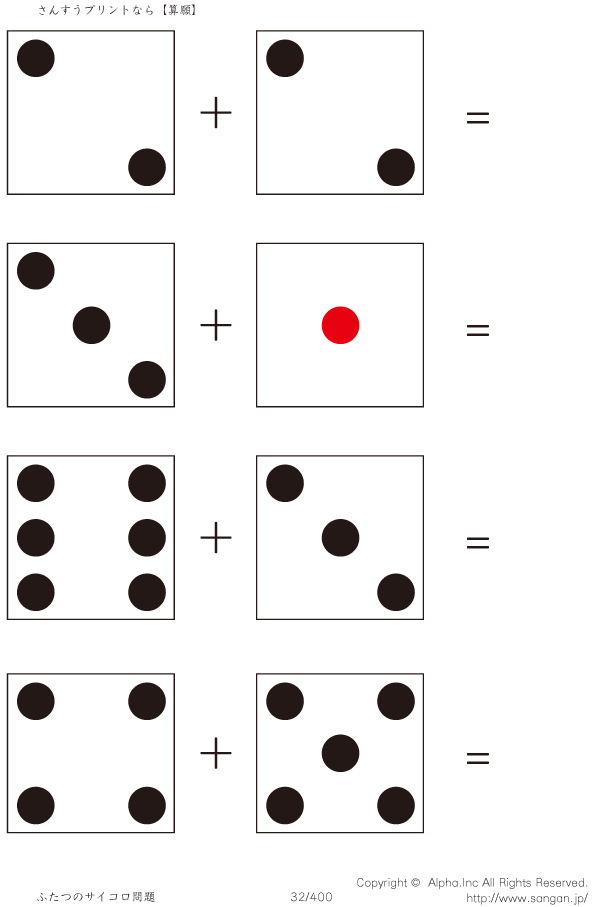 上記のボタンから「2つのサイコロの足し算」の算数数学ドリル・計算ドリル(PDFプリント)がダウンロードできます。個人利用は無料です(家庭以外での配布は有料です)。