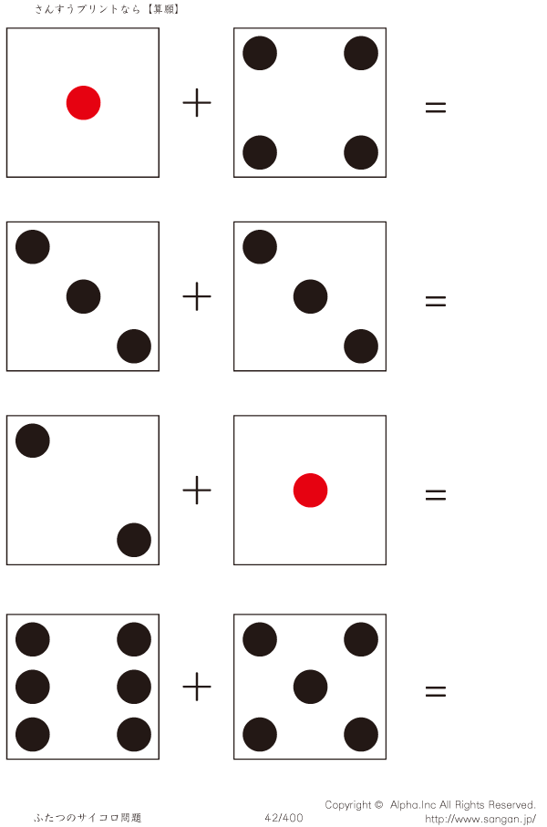 上記のボタンから「2つのサイコロの足し算」の算数数学ドリル・計算ドリル(PDFプリント)がダウンロードできます。個人利用は無料です(家庭以外での配布は有料です)。