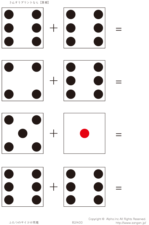 上記のボタンから「2つのサイコロの足し算」の算数数学ドリル・計算ドリル(PDFプリント)がダウンロードできます。個人利用は無料です(家庭以外での配布は有料です)。