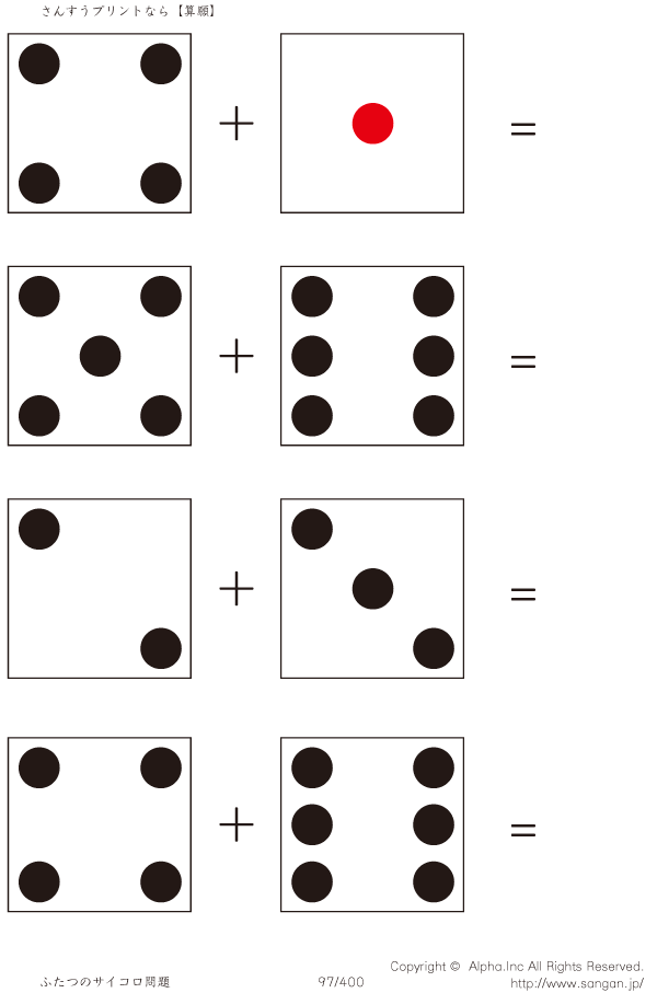 上記のボタンから「2つのサイコロの足し算」の算数数学ドリル・計算ドリル(PDFプリント)がダウンロードできます。個人利用は無料です(家庭以外での配布は有料です)。