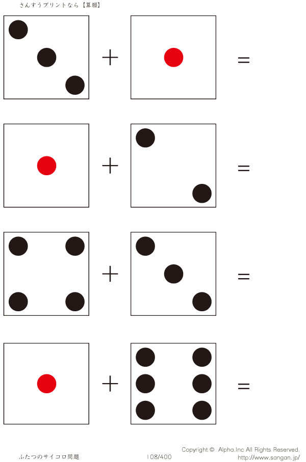 上記のボタンから「2つのサイコロの足し算」の算数数学ドリル・計算ドリル(PDFプリント)がダウンロードできます。個人利用は無料です(家庭以外での配布は有料です)。