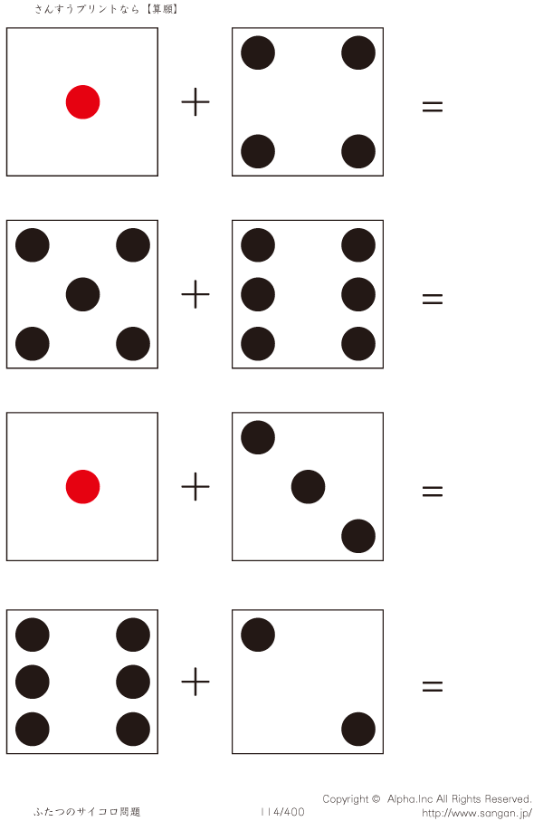 上記のボタンから「2つのサイコロの足し算」の算数数学ドリル・計算ドリル(PDFプリント)がダウンロードできます。個人利用は無料です(家庭以外での配布は有料です)。