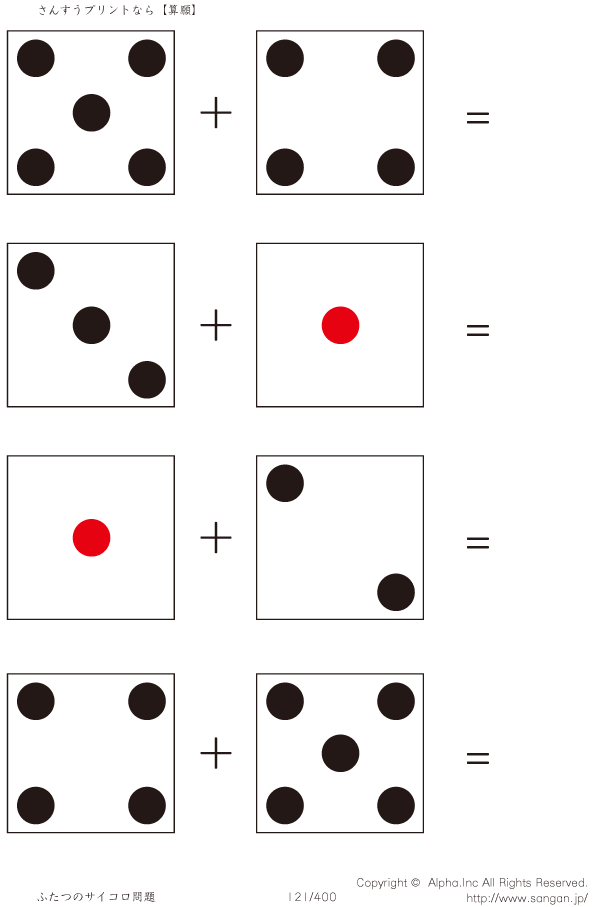 上記のボタンから「2つのサイコロの足し算」の算数数学ドリル・計算ドリル(PDFプリント)がダウンロードできます。個人利用は無料です(家庭以外での配布は有料です)。