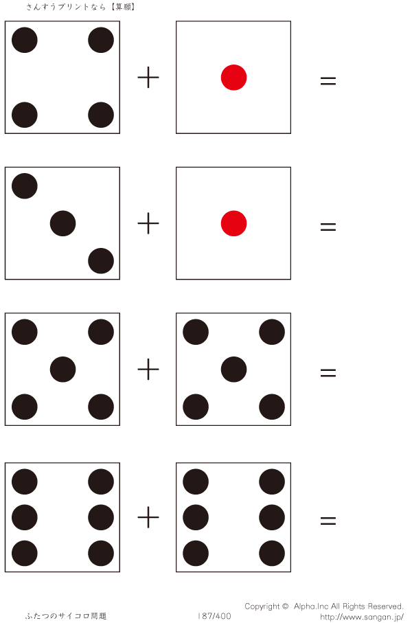 上記のボタンから「2つのサイコロの足し算」の算数数学ドリル・計算ドリル(PDFプリント)がダウンロードできます。個人利用は無料です(家庭以外での配布は有料です)。