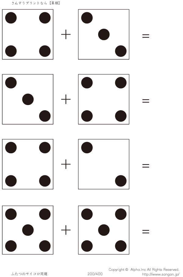上記のボタンから「2つのサイコロの足し算」の算数数学ドリル・計算ドリル(PDFプリント)がダウンロードできます。個人利用は無料です(家庭以外での配布は有料です)。