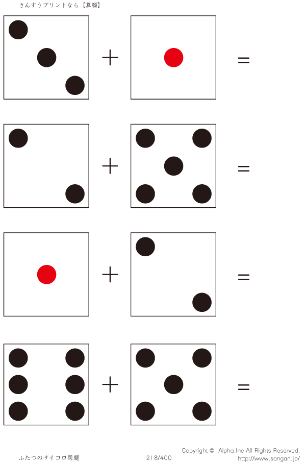 上記のボタンから「2つのサイコロの足し算」の算数数学ドリル・計算ドリル(PDFプリント)がダウンロードできます。個人利用は無料です(家庭以外での配布は有料です)。