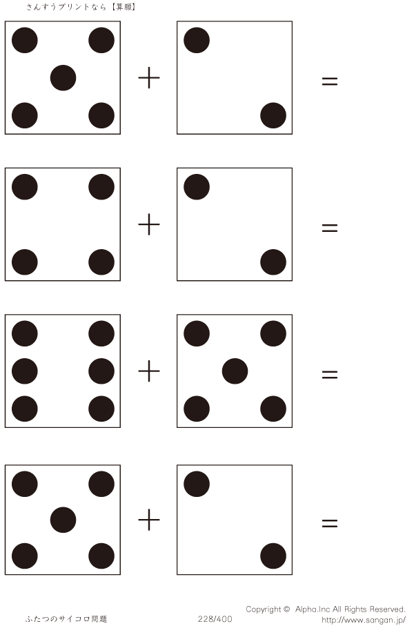 上記のボタンから「2つのサイコロの足し算」の算数数学ドリル・計算ドリル(PDFプリント)がダウンロードできます。個人利用は無料です(家庭以外での配布は有料です)。