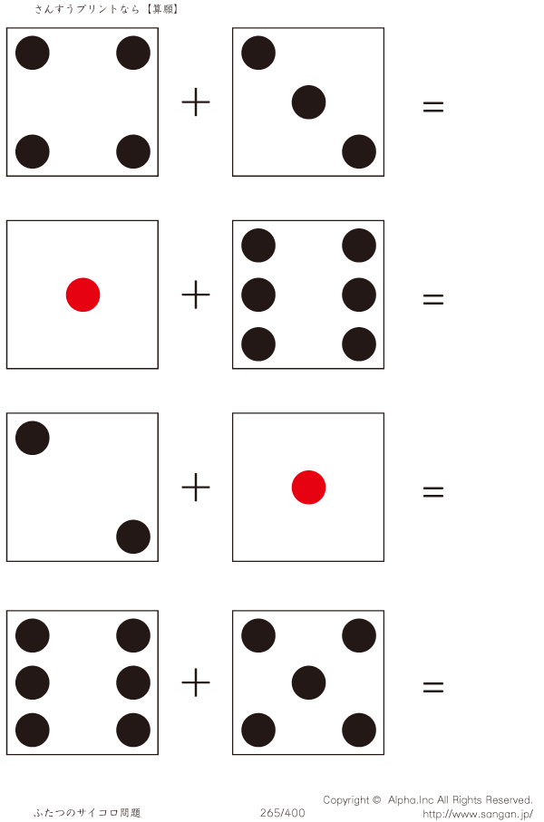 上記のボタンから「2つのサイコロの足し算」の算数数学ドリル・計算ドリル(PDFプリント)がダウンロードできます。個人利用は無料です(家庭以外での配布は有料です)。