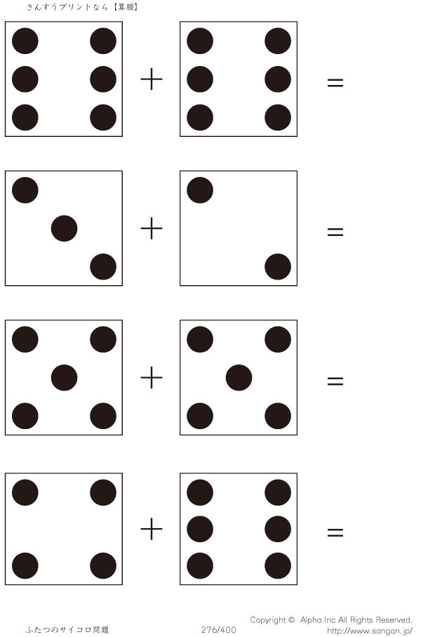 上記のボタンから「2つのサイコロの足し算」の算数数学ドリル・計算ドリル(PDFプリント)がダウンロードできます。個人利用は無料です(家庭以外での配布は有料です)。