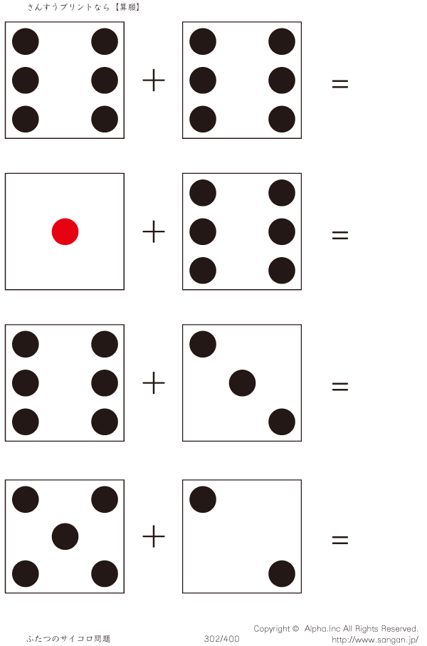 上記のボタンから「2つのサイコロの足し算」の算数数学ドリル・計算ドリル(PDFプリント)がダウンロードできます。個人利用は無料です(家庭以外での配布は有料です)。