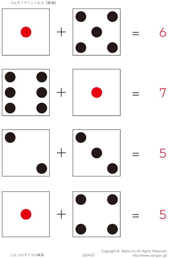 上記のボタンから「2つのサイコロの足し算」の算数数学ドリル・計算ドリル(PDFプリント)がダウンロードできます。個人利用は無料です(家庭以外での配布は有料です)。