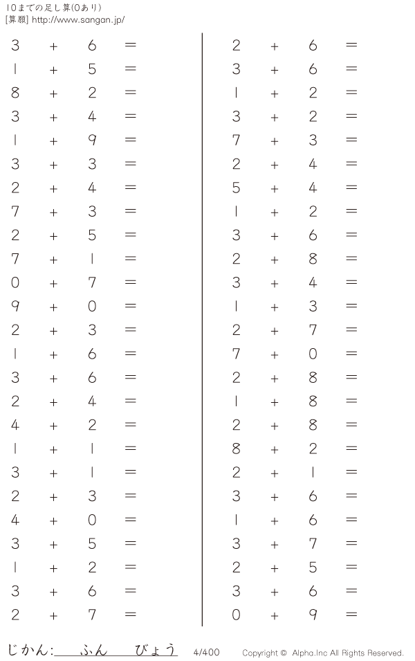 上記のボタンから「10までの足し算」の算数数学ドリル・計算ドリル(PDFプリント)がダウンロードできます。個人利用は無料です(家庭以外での配布は有料です)。