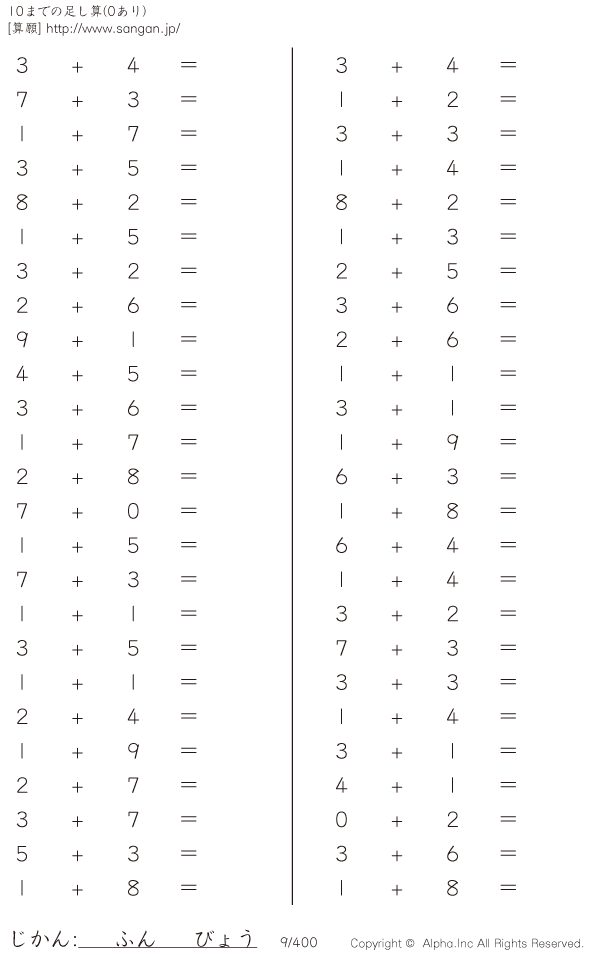 上記のボタンから「10までの足し算」の算数数学ドリル・計算ドリル(PDFプリント)がダウンロードできます。個人利用は無料です(家庭以外での配布は有料です)。