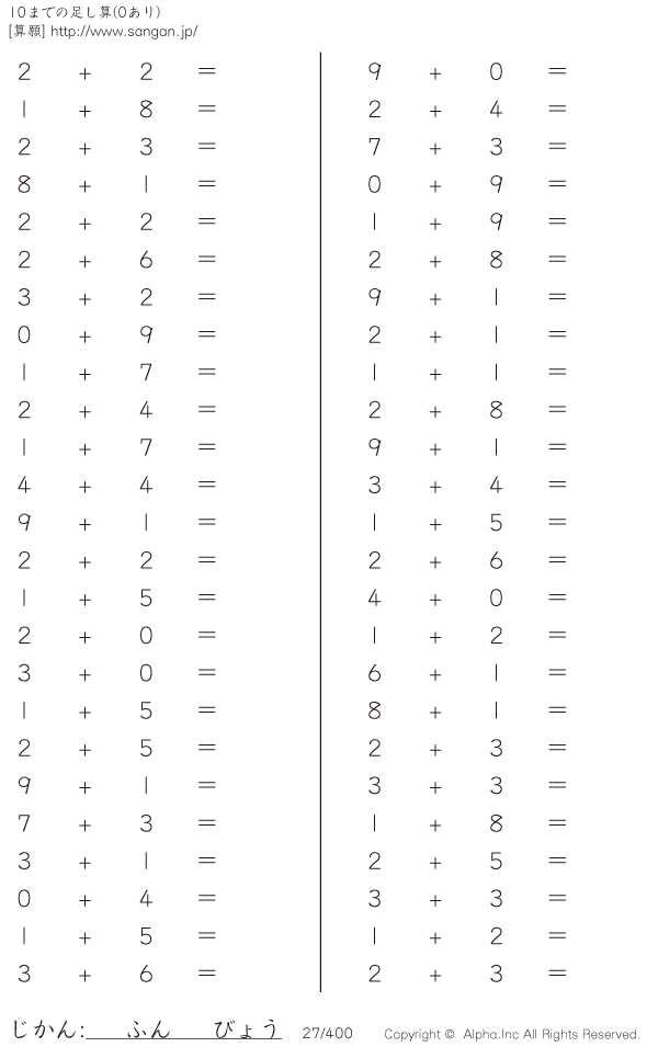 上記のボタンから「10までの足し算」の算数数学ドリル・計算ドリル(PDFプリント)がダウンロードできます。個人利用は無料です(家庭以外での配布は有料です)。