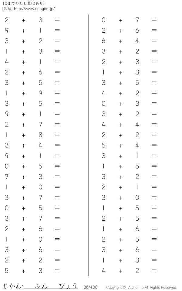 上記のボタンから「10までの足し算」の算数数学ドリル・計算ドリル(PDFプリント)がダウンロードできます。個人利用は無料です(家庭以外での配布は有料です)。