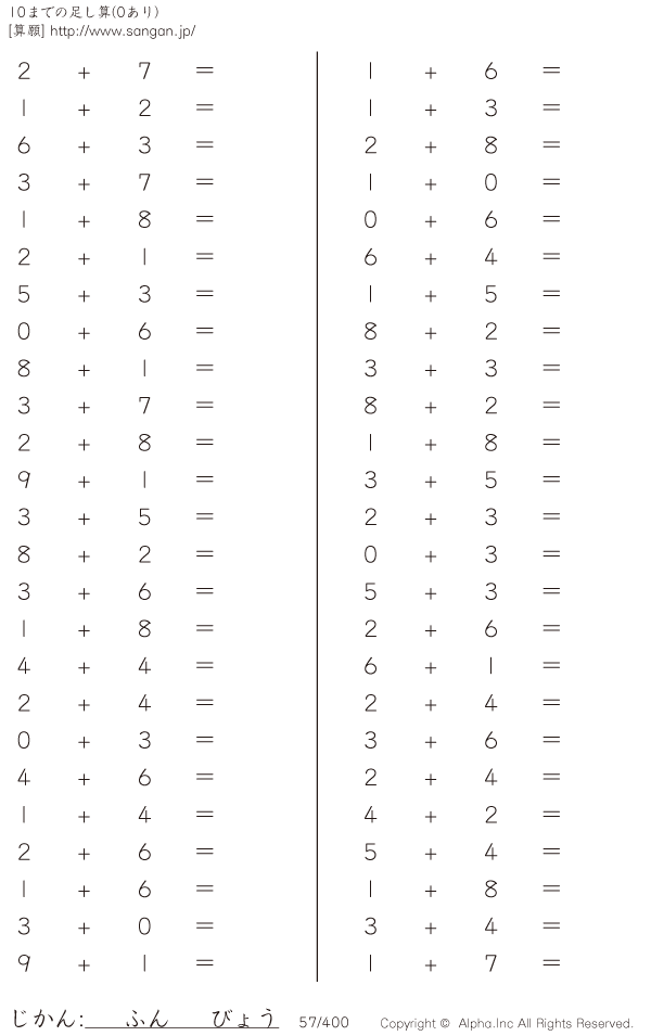 上記のボタンから「10までの足し算」の算数数学ドリル・計算ドリル(PDFプリント)がダウンロードできます。個人利用は無料です(家庭以外での配布は有料です)。