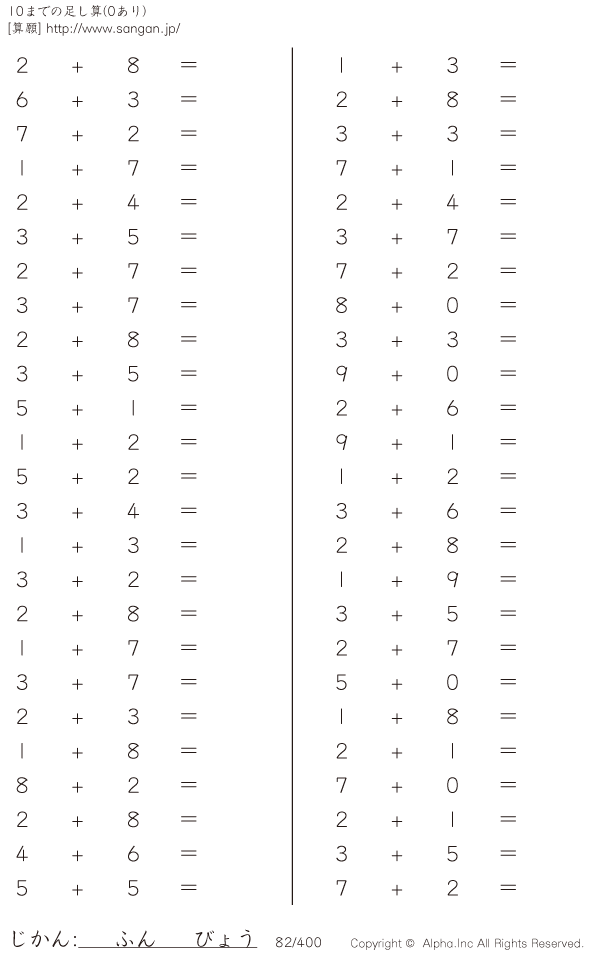 上記のボタンから「10までの足し算」の算数数学ドリル・計算ドリル(PDFプリント)がダウンロードできます。個人利用は無料です(家庭以外での配布は有料です)。