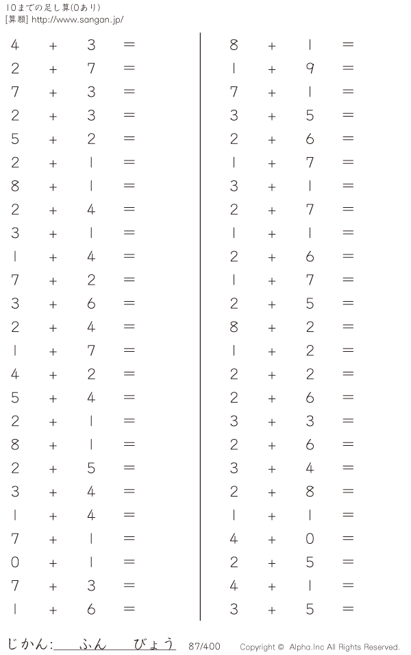 上記のボタンから「10までの足し算」の算数数学ドリル・計算ドリル(PDFプリント)がダウンロードできます。個人利用は無料です(家庭以外での配布は有料です)。