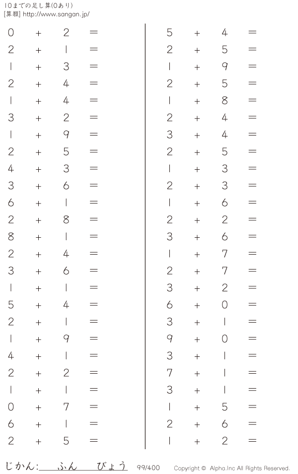 上記のボタンから「10までの足し算」の算数数学ドリル・計算ドリル(PDFプリント)がダウンロードできます。個人利用は無料です(家庭以外での配布は有料です)。