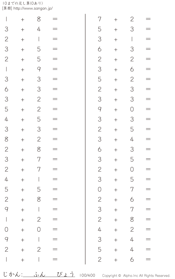 上記のボタンから「10までの足し算」の算数数学ドリル・計算ドリル(PDFプリント)がダウンロードできます。個人利用は無料です(家庭以外での配布は有料です)。