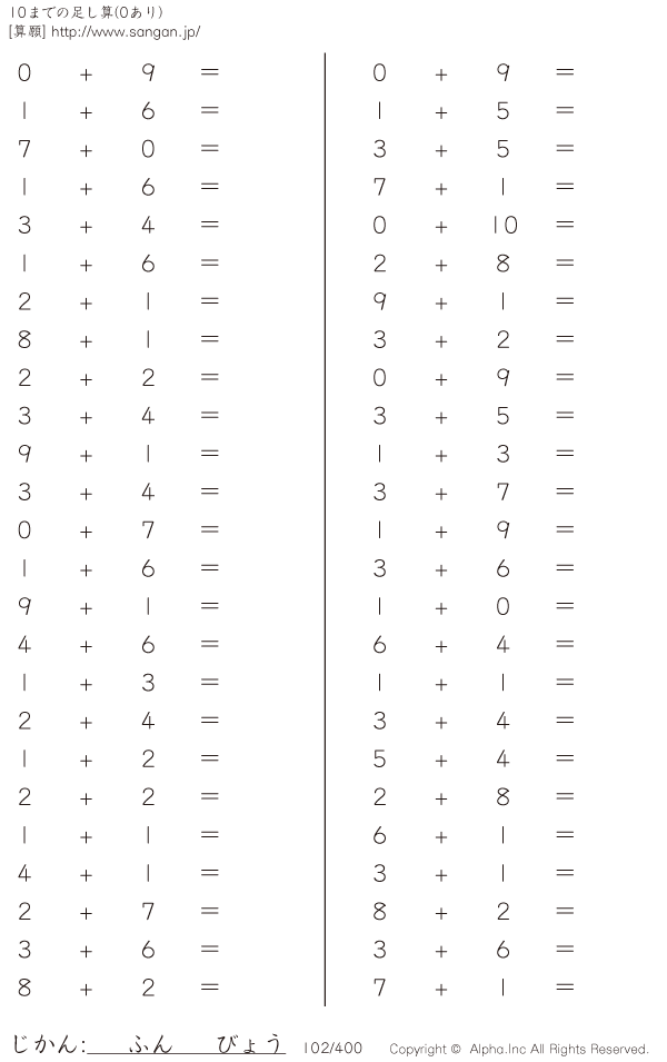 上記のボタンから「10までの足し算」の算数数学ドリル・計算ドリル(PDFプリント)がダウンロードできます。個人利用は無料です(家庭以外での配布は有料です)。