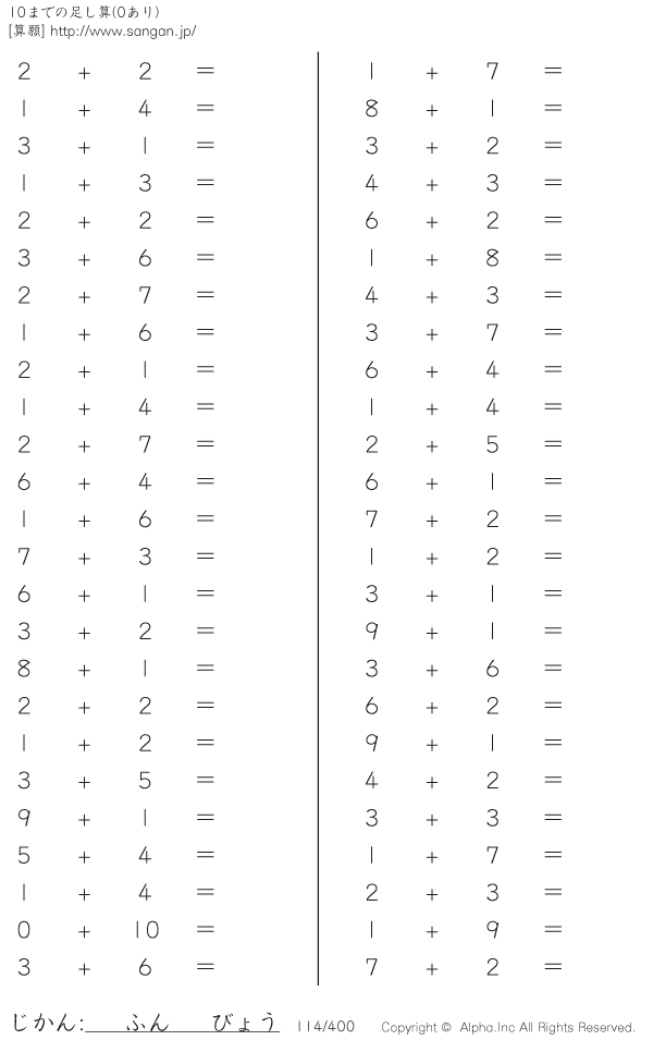 上記のボタンから「10までの足し算」の算数数学ドリル・計算ドリル(PDFプリント)がダウンロードできます。個人利用は無料です(家庭以外での配布は有料です)。