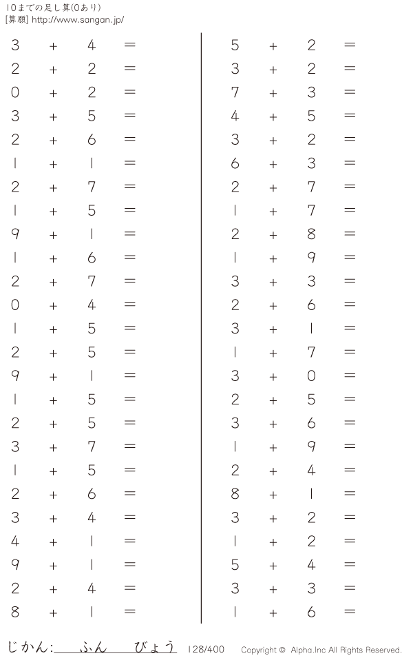 上記のボタンから「10までの足し算」の算数数学ドリル・計算ドリル(PDFプリント)がダウンロードできます。個人利用は無料です(家庭以外での配布は有料です)。