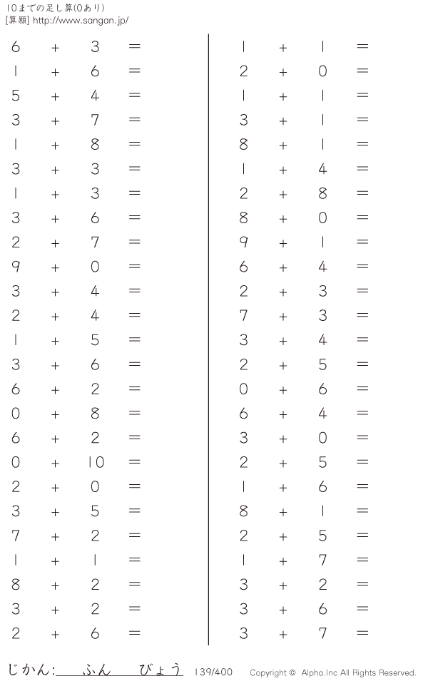 上記のボタンから「10までの足し算」の算数数学ドリル・計算ドリル(PDFプリント)がダウンロードできます。個人利用は無料です(家庭以外での配布は有料です)。
