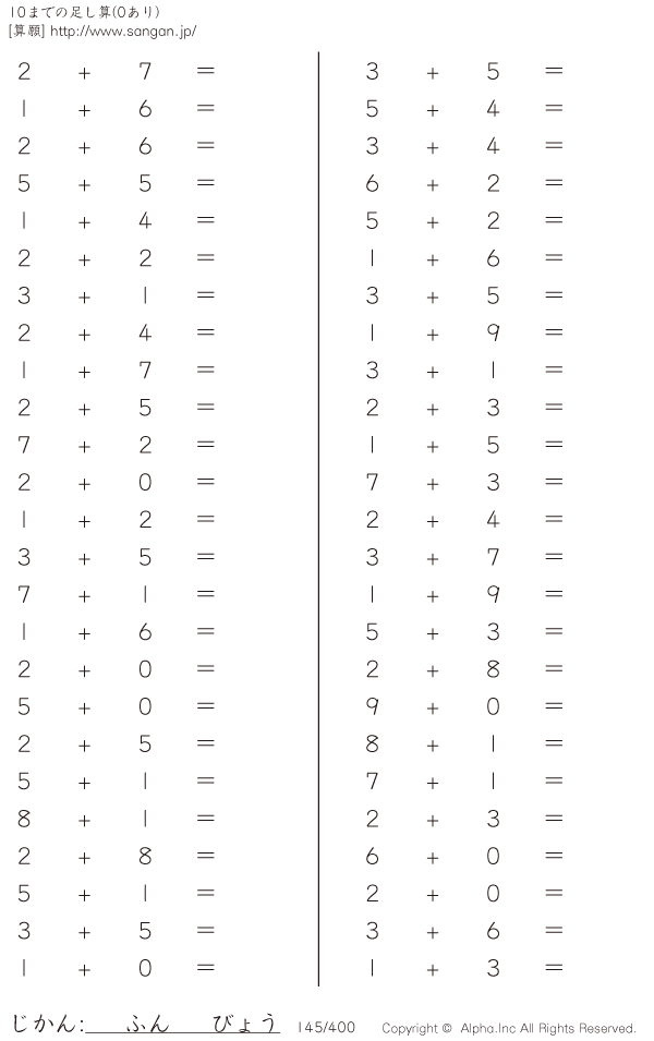 上記のボタンから「10までの足し算」の算数数学ドリル・計算ドリル(PDFプリント)がダウンロードできます。個人利用は無料です(家庭以外での配布は有料です)。