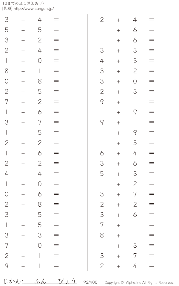 上記のボタンから「10までの足し算」の算数数学ドリル・計算ドリル(PDFプリント)がダウンロードできます。個人利用は無料です(家庭以外での配布は有料です)。