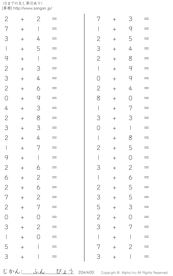 上記のボタンから「10までの足し算」の算数数学ドリル・計算ドリル(PDFプリント)がダウンロードできます。個人利用は無料です(家庭以外での配布は有料です)。