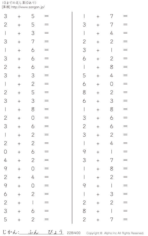 上記のボタンから「10までの足し算」の算数数学ドリル・計算ドリル(PDFプリント)がダウンロードできます。個人利用は無料です(家庭以外での配布は有料です)。