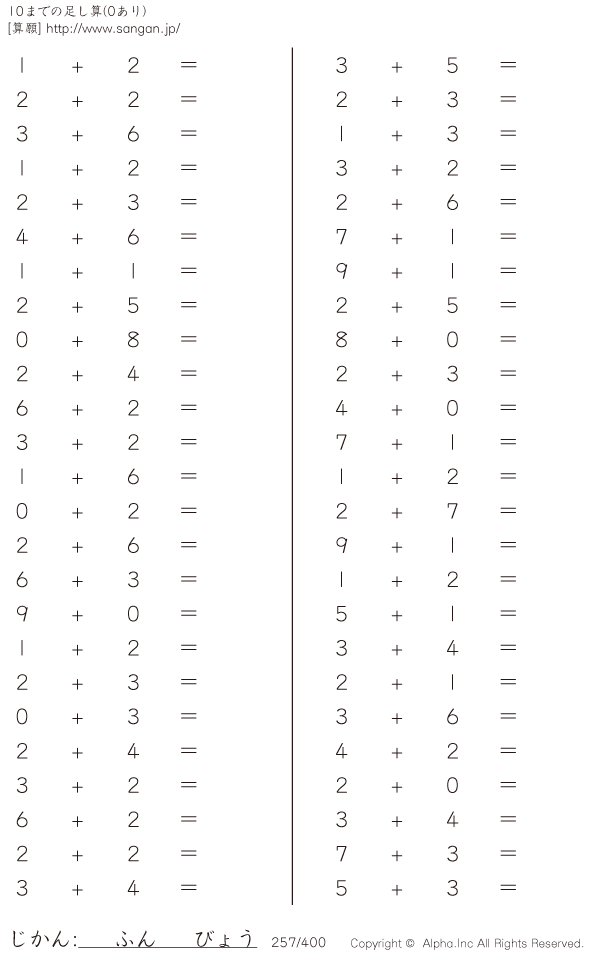 上記のボタンから「10までの足し算」の算数数学ドリル・計算ドリル(PDFプリント)がダウンロードできます。個人利用は無料です(家庭以外での配布は有料です)。