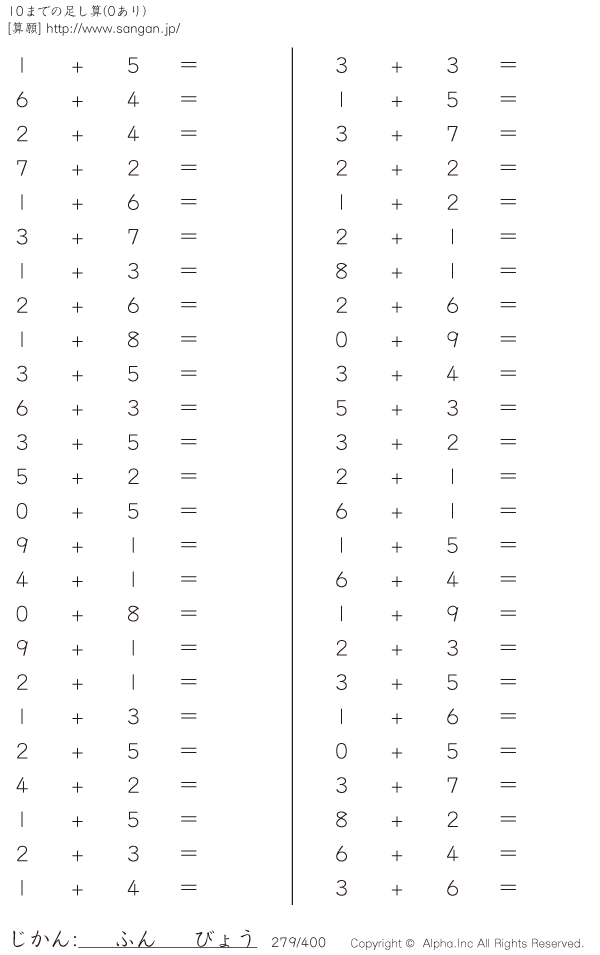 上記のボタンから「10までの足し算」の算数数学ドリル・計算ドリル(PDFプリント)がダウンロードできます。個人利用は無料です(家庭以外での配布は有料です)。