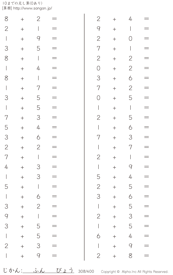 上記のボタンから「10までの足し算」の算数数学ドリル・計算ドリル(PDFプリント)がダウンロードできます。個人利用は無料です(家庭以外での配布は有料です)。