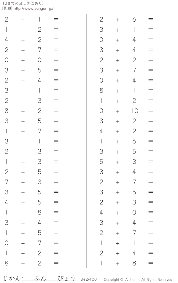 上記のボタンから「10までの足し算」の算数数学ドリル・計算ドリル(PDFプリント)がダウンロードできます。個人利用は無料です(家庭以外での配布は有料です)。