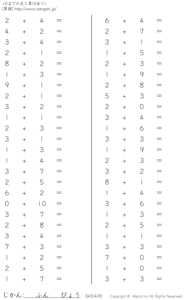 上記のボタンから「10までの足し算」の算数数学ドリル・計算ドリル(PDFプリント)がダウンロードできます。個人利用は無料です(家庭以外での配布は有料です)。