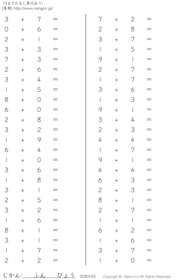 上記のボタンから「10までの足し算」の算数数学ドリル・計算ドリル(PDFプリント)がダウンロードできます。個人利用は無料です(家庭以外での配布は有料です)。