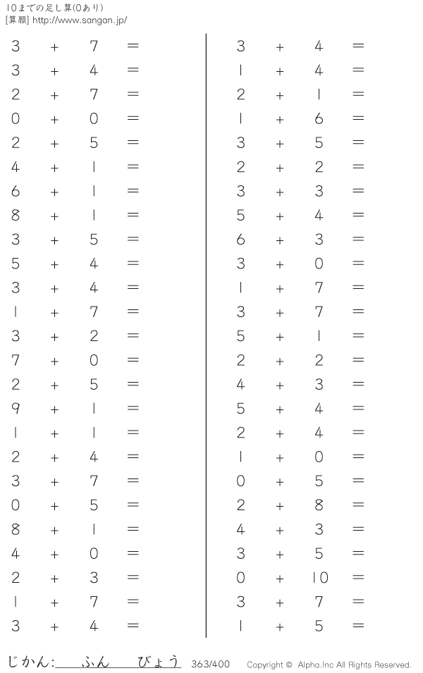 上記のボタンから「10までの足し算」の算数数学ドリル・計算ドリル(PDFプリント)がダウンロードできます。個人利用は無料です(家庭以外での配布は有料です)。