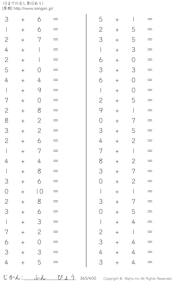 上記のボタンから「10までの足し算」の算数数学ドリル・計算ドリル(PDFプリント)がダウンロードできます。個人利用は無料です(家庭以外での配布は有料です)。