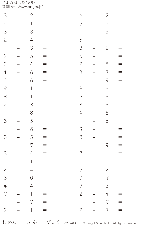 上記のボタンから「10までの足し算」の算数数学ドリル・計算ドリル(PDFプリント)がダウンロードできます。個人利用は無料です(家庭以外での配布は有料です)。