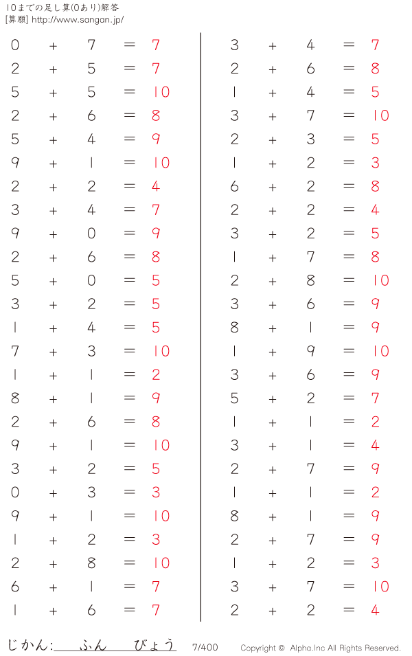 上記のボタンから「10までの足し算」の算数数学ドリル・計算ドリル(PDFプリント)がダウンロードできます。個人利用は無料です(家庭以外での配布は有料です)。