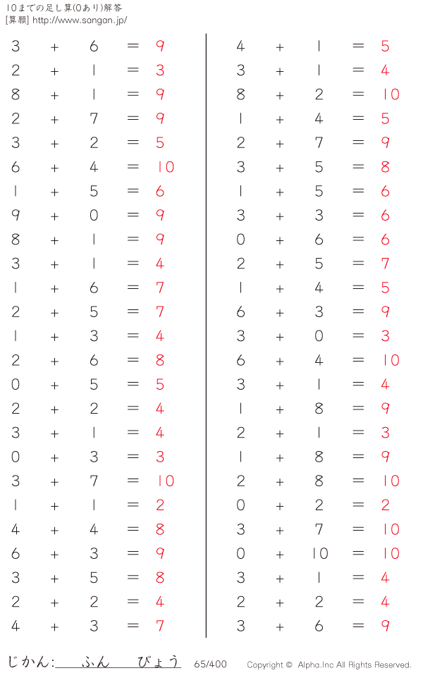 上記のボタンから「10までの足し算」の算数数学ドリル・計算ドリル(PDFプリント)がダウンロードできます。個人利用は無料です(家庭以外での配布は有料です)。