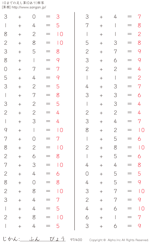 上記のボタンから「10までの足し算」の算数数学ドリル・計算ドリル(PDFプリント)がダウンロードできます。個人利用は無料です(家庭以外での配布は有料です)。