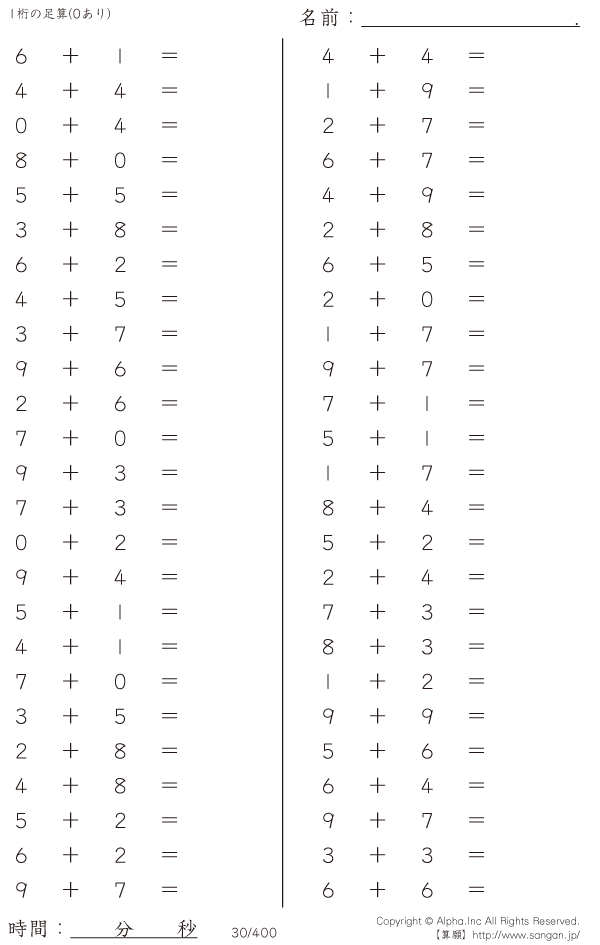 上記のボタンから「1桁の足し算(0あり)」の算数数学ドリル・計算ドリル(PDFプリント)がダウンロードできます。個人利用は無料です(家庭以外での配布は有料です)。