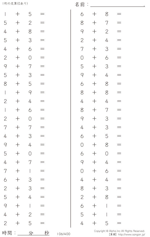 上記のボタンから「1桁の足し算(0あり)」の算数数学ドリル・計算ドリル(PDFプリント)がダウンロードできます。個人利用は無料です(家庭以外での配布は有料です)。