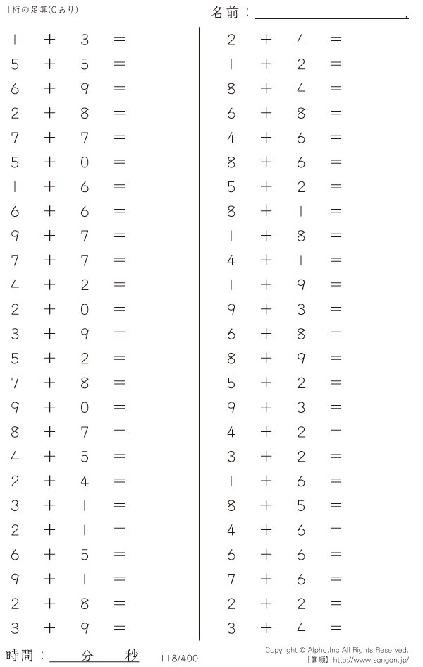 上記のボタンから「1桁の足し算(0あり)」の算数数学ドリル・計算ドリル(PDFプリント)がダウンロードできます。個人利用は無料です(家庭以外での配布は有料です)。