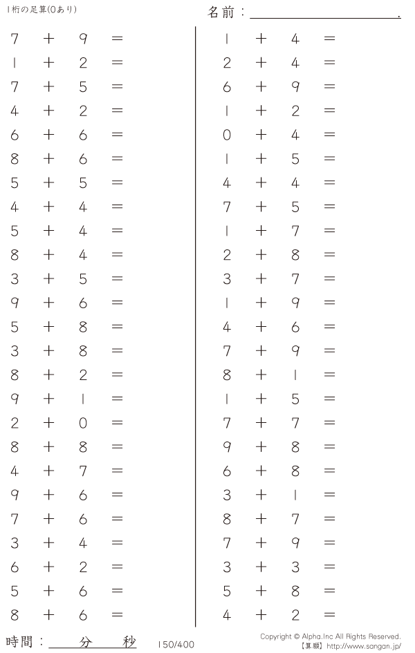 上記のボタンから「1桁の足し算(0あり)」の算数数学ドリル・計算ドリル(PDFプリント)がダウンロードできます。個人利用は無料です(家庭以外での配布は有料です)。