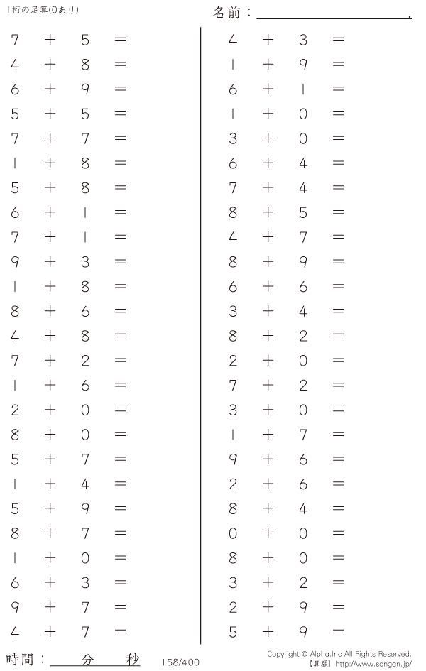1桁の足し算(0あり) [問題]158/400